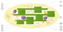 Chloroplast ultrastructure 1. outer membrane 2. intermembrane space 3. inner membrane (1+2+3: envelope) 4. stroma (aqueous fluid) 5. thylakoid lumen (inside of thylakoid) 6. thylakoid membrane 7. granum (stack of thylakoids) 8. thylakoid (lamella) 9. starch 10. ribosome 11. plastidial DNA 12. drop of lipids)