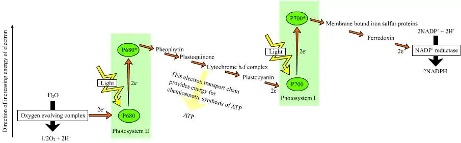 Non-cyclic photophosphorylation utilises both photosystems in a "Z-Scheme". See picture above. Light is absorbed by both photosystems I and II, and excited electrons are passed from both primary pigments to electron acceptors as well as electron transport chain before exiting the photosystems positively charged. Photosystem I receives electrons from photosystem II, which instead replenishes electrons from the photolysis of water. In this chain, as in cyclic, ATP is synthesised using the energy lost during the phase of electron transport chain.