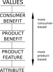 The further up the ladder you go, the more consumer-based the message becomes. The further down you go, the more product-based it becomes. You can see that the first two statements tell how the product helps the consumer ("me"), while the other statements focus more and more on the product (X).