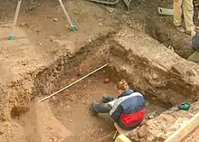 Archaeologists work through the study not only of objects, but their relationships to one another. When first excavating a site, an archaeologist will lay down a grid over the earth, usually constructed of stakes in the ground, and cords. The grid divides the land beneath it into many small squares of equal size. Once digging begins, a good archaeologist records what she or he finds, and where. The grid helps define what else a given object was found near. Thus, if a gold bracelet is found near the skeleton of a woman, the archaeologist may assume that the woman and the bracelet were buried at the same time. On the other hand, a bronze sword in the ground forty feet away and ten feet deeper probably was not buried at the same time as the woman or the bracelet.