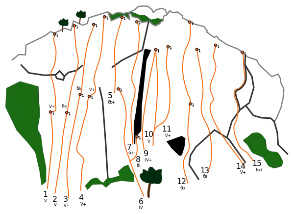 | # | Name | Grade | Notes | # Bolts | (m) | Equipped by |
