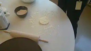 Putting flour on a flat table, in preparation for rolling out the dough.