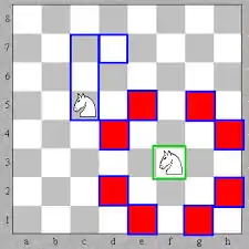 Picture below shows at any instances, knight piece are allowed to be placed at one of the locations marked with red colours.