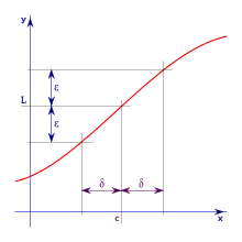 Given a function ƒ; a limit L; and an approaching value c, ∀ε > 0, ∃δ > 0 such that ∀x, .